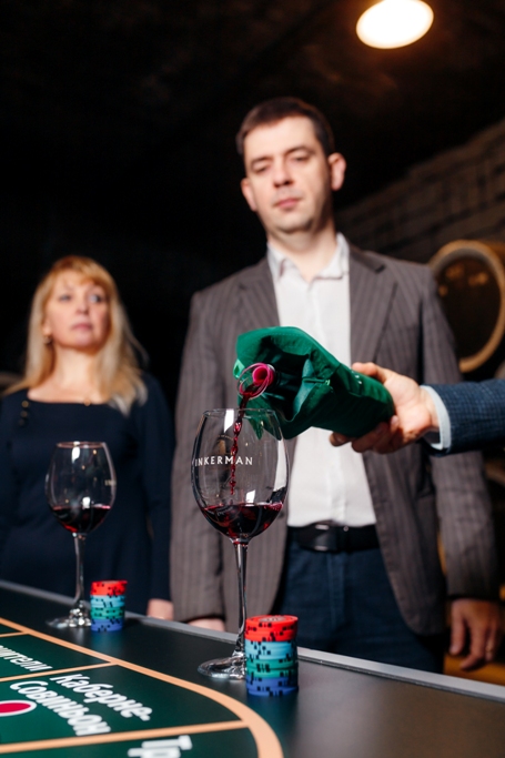 Каждый участник получает фишки для игры в покер, Ведущий знакомит гостей с основными этапами и правилами дегустации вин, рассказывает о сортах и их характеристиках. Далее из бутылок с закрытыми этикетками сомелье наливает гостям поочередно вина ТМ INKERMAN. Гости дегустируют вино вслепую.В ходе дискуссии определяют сортовой состав вина, год урожая.